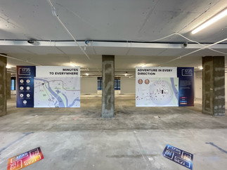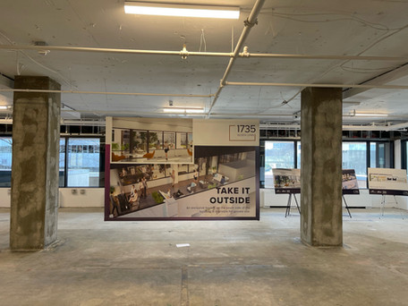 We've opted for the bold colors on floor decals to guide the prospects thru the shell space, and oversized panels printed on a thick canvas and installed around the column core. A wall collage with the amenity photos, pop-out tag lines and interactive polling station to vote for your favorite building renovation completed the look and provided some context to the scope and complexity of this repositioning assignment.